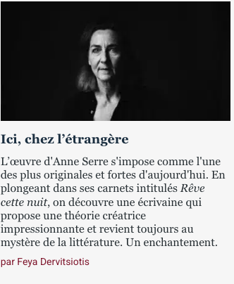 L’œuvre d’Anne Serre s’impose comme l’une des plus originales et fortes d’aujourd’hui. En plongeant dans ses carnets intitulés Rêve cette nuit, on découvre une écrivaine qui propose une théorie créatrice impressionnante et revient toujours au mystère de la littérature. Un enchantement.