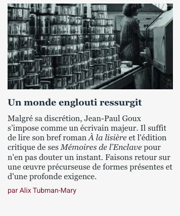 Malgré sa discrétion, Jean-Paul Goux s’impose comme un écrivain majeur. Il suffit de lire son bref roman À la lisière et l’édition critique de ses Mémoires de l’Enclave pour n’en pas douter un instant. Faisons retour sur une œuvre précurseuse de formes présentes et d’une profonde exigence.